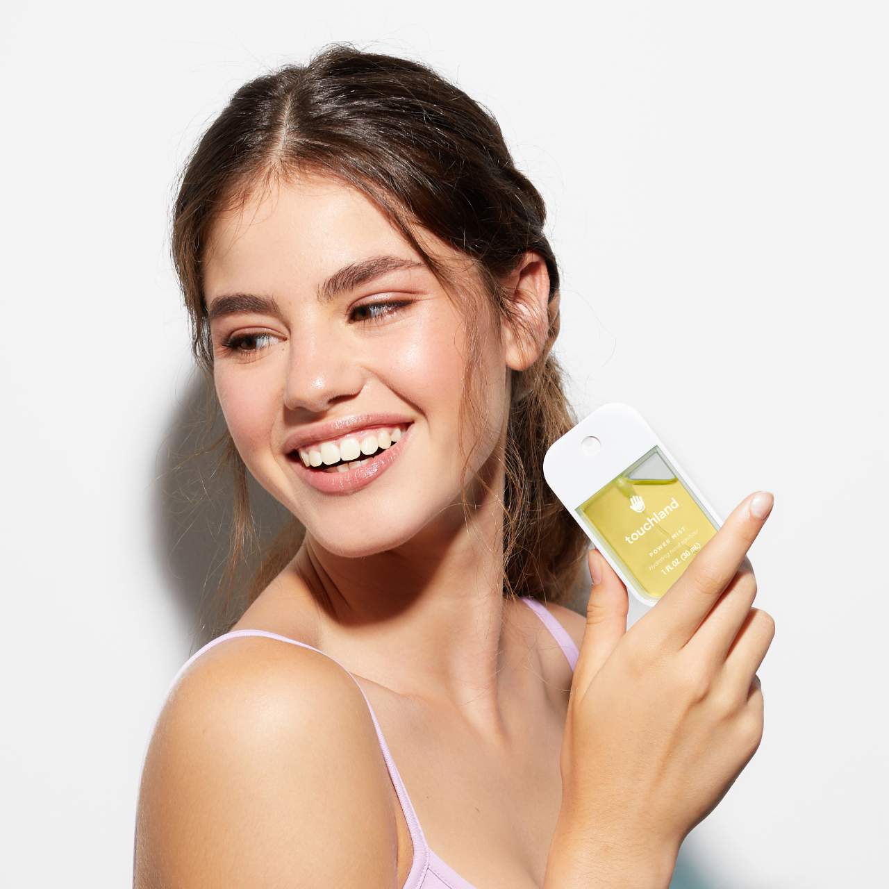 Touchland Power Mist Hydrating Hand Sanitizer is a skincare-forward hand mist enriched with aloe vera and essential oils, leaving hands sanitized, hydrated, and delicately scented.